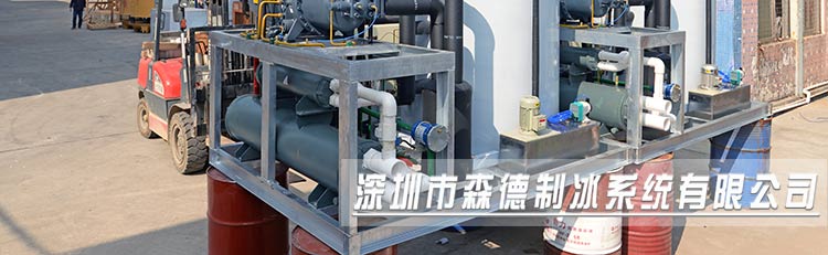 片冰機主要由壓縮機膨脹閥、冷凝器、蒸發器組成形成一個循環封閉的制冷系統。片冰機蒸發器為垂直豎立的桶裝結構,主要由冰刀、主軸、灑水盤、接水盤組成。它們在減速機的帶動下,逆時針緩慢旋轉。水從片冰機蒸發器的進水口進入分水盤,通過灑水盤,將水均勻的灑在蒸發器內壁,形成水膜;水膜與蒸發器流道中的制冷劑進行熱交換,溫度迅速降低,在蒸發器內壁上形成一層薄冰,在冰刀的擠壓下,碎裂成片冰,從落冰口掉入儲冰庫。部分未結成冰的水通過接水盤從回水口回流到冷水箱內,通過冷水循環泵進入下一個循環。